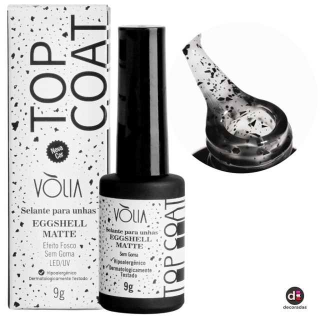 O Top Coat Eggshell Matte da Vòlia possui um acabamento fosco com delicadas partículas pretas que criam o fascinante efeito de casca de ovo. Atua como selante em gel de forma a proporcionar maior resistência e durabilidade. Produto fotossensível.